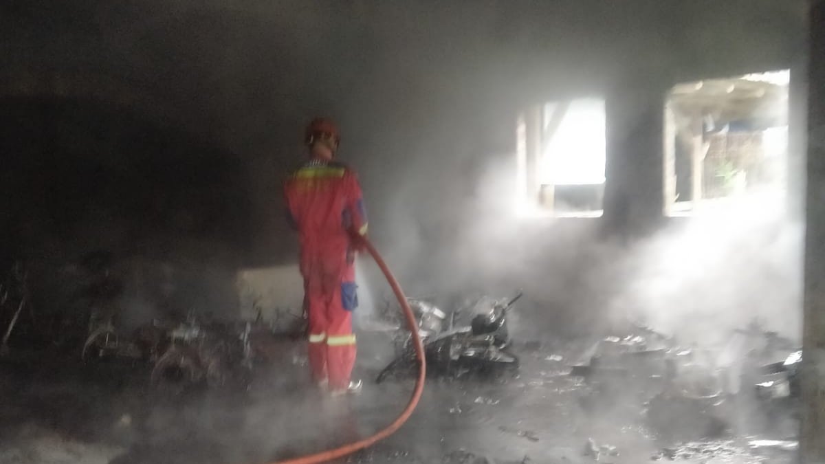 Kejadian tersebut mengakibatkan sebanyak 10 sepeda motor yang sedang terparkir hangus terbakar dan 9 unit lainnya terdampak.