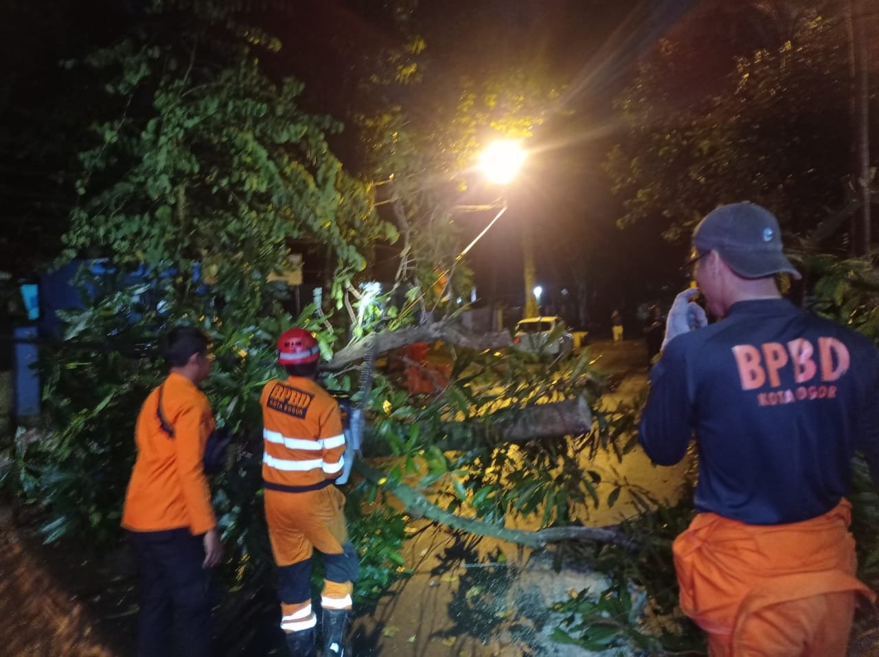Petugas dari BPBD Kota Bogor bekerja sama dengan unsur terkait, seperti Kelurahan Tanah Sareal, Bhabinkamtibmas, Babinsa, Satpol PP, PLN, serta warga sekitar, melakukan pemangkasan dan pembersihan material pohon agar jalan dapat segera dilalui kembali.