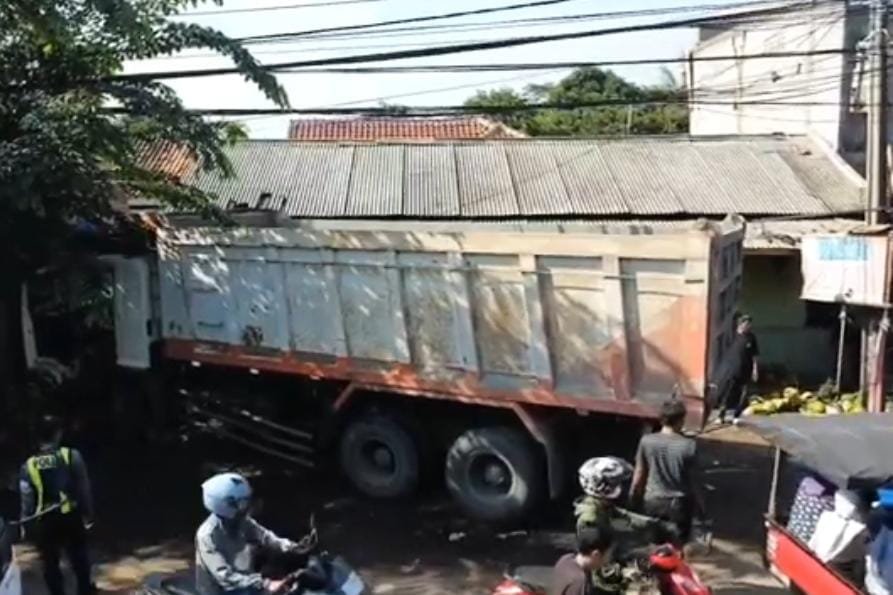 Lalu, truk Dump Hino terus bergerak ke kanan jalan dan menabrak bangunan yang berada di sebelah kanan.