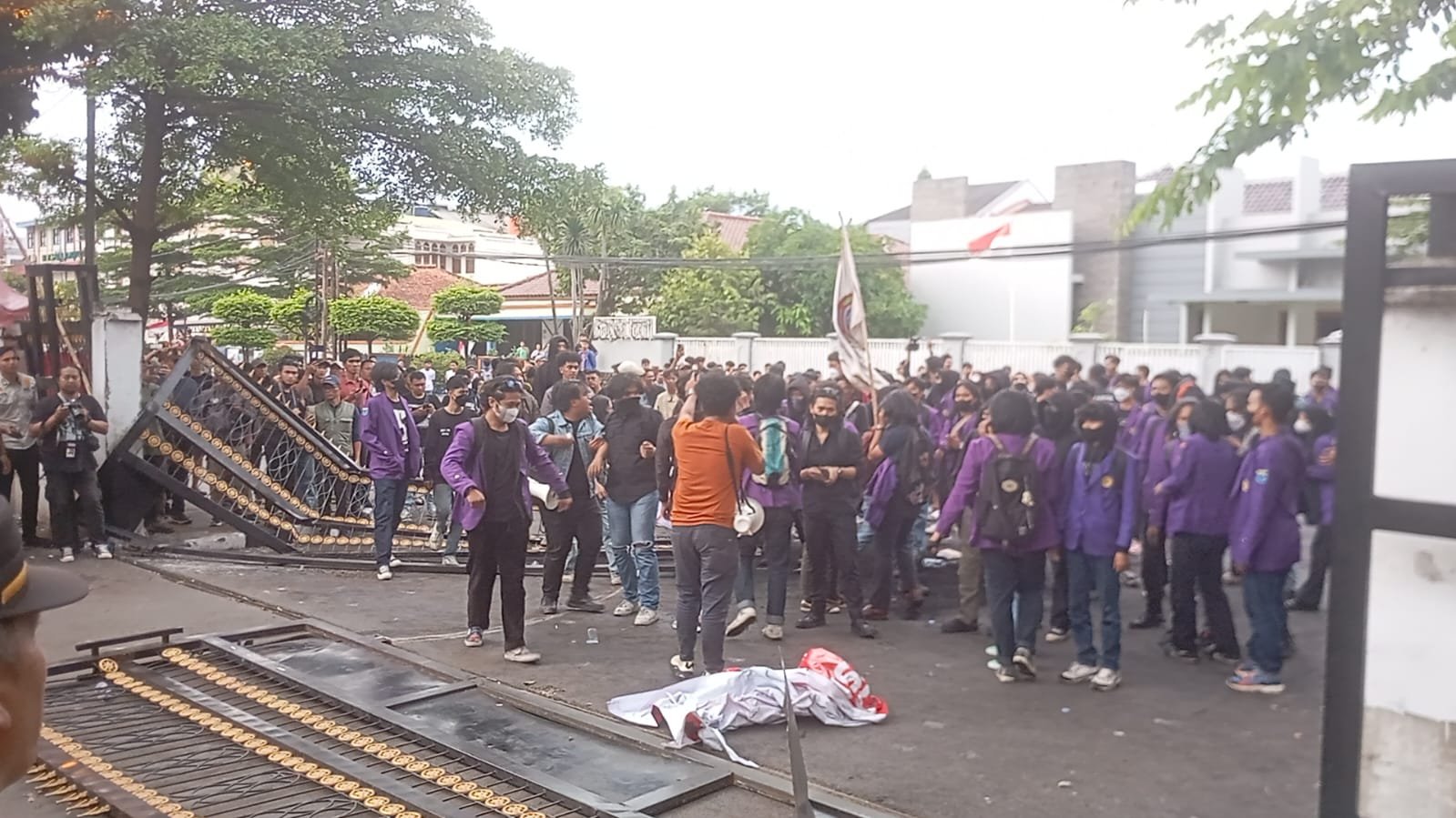 Ketegangan meningkat saat mahasiswa merobohkan pagar dan terlibat dorong-dorongan dengan petugas yang berjaga.