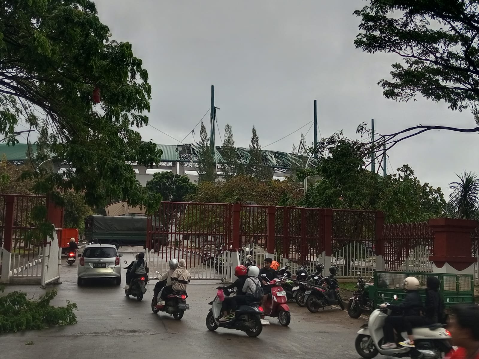 Berdasarkan video yang beredar, atap dari Gelora Pakansari beterbangan disapu oleh angin yang cukup kencang. Bahkan, puluhan pohon pun terlihat bertumbangan.