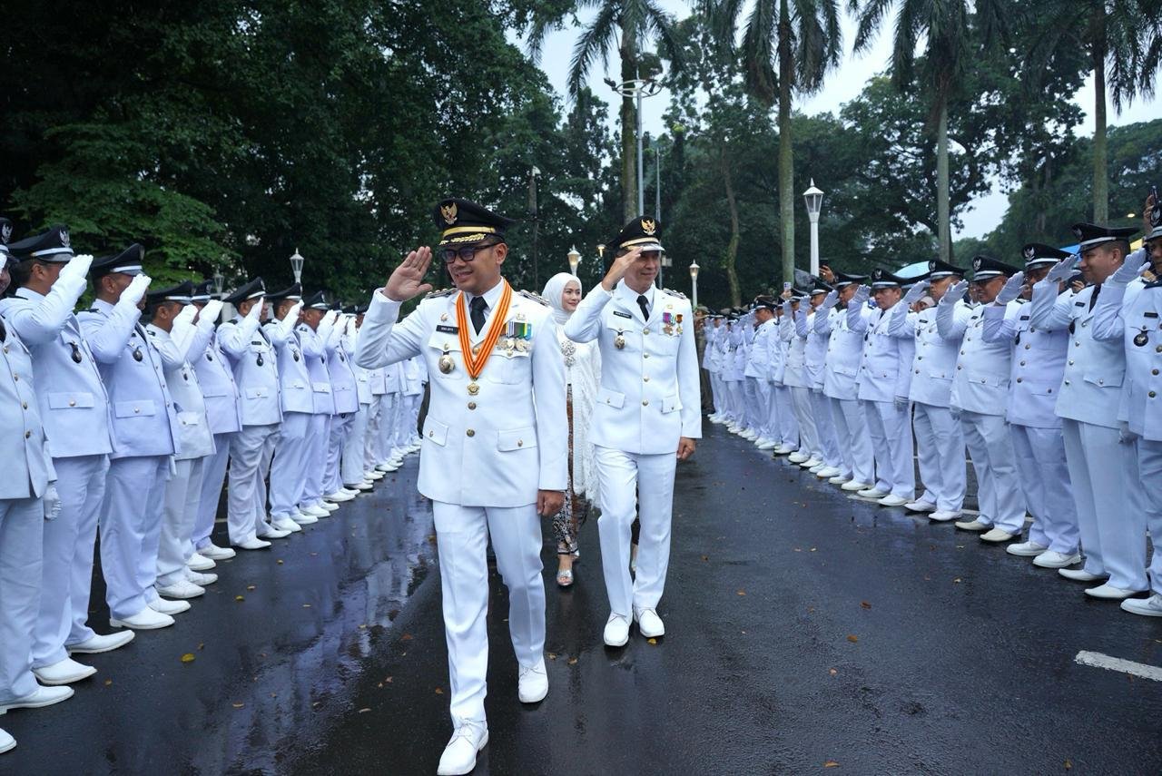 Wali Kota Bogor Bima Arya dan Wakil Wali Kota Bogor Dedie A. Rachim bersikap hormat saat kegiatan Apresiasi ASN Pemkot Bogor di Plaza Balai Kota Bogor, Jumat, 19 April 2024. Dok. Pemkot Bogor.