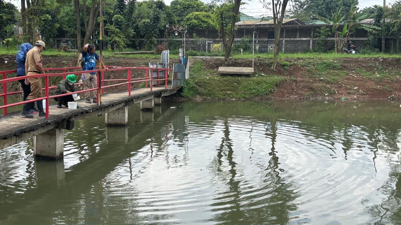 Bogor24Update – Dinas Lingkungan Hidup (DLH) Kabupaten Bogor, mengambil sampel air untuk dilakukan uji laboratorium pasca mati mendadaknya ribuan ikan di Situ Citongtut, Desa Cicadas, Kecamatan Gunungputri.