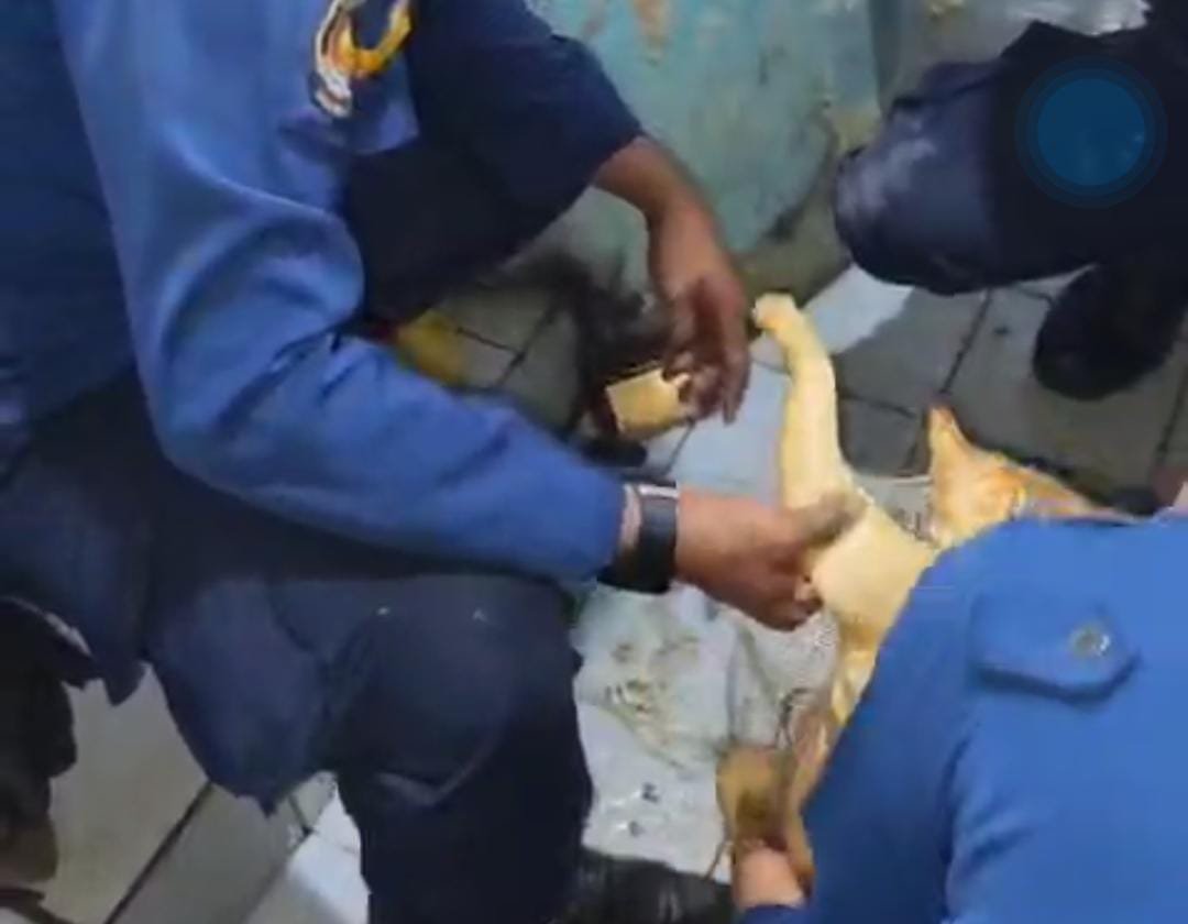Tak butuh waktu lama, Arman bersama timnya langsung melakukan penanganan dengan menyelamatkan kucing menggunakan tali.