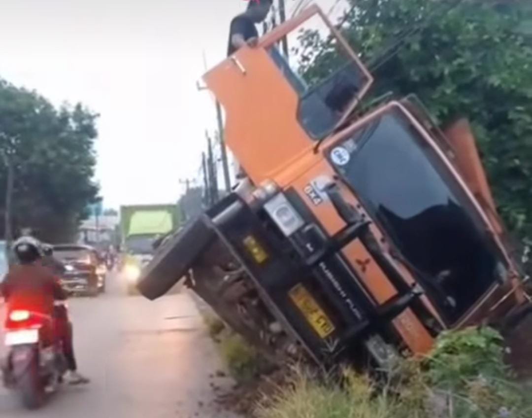 Bogor24Update – Satu unit Mitsubishi Dump Truk bernopol B 9262 CYU terguling di Jalan Raya Setu-Cileungsi, Kampung Rawaikik, Desa Limusnunggal, Kecamatan Cileungsi, Kabupaten Bogor, Kamis 16 Oktober 2025.