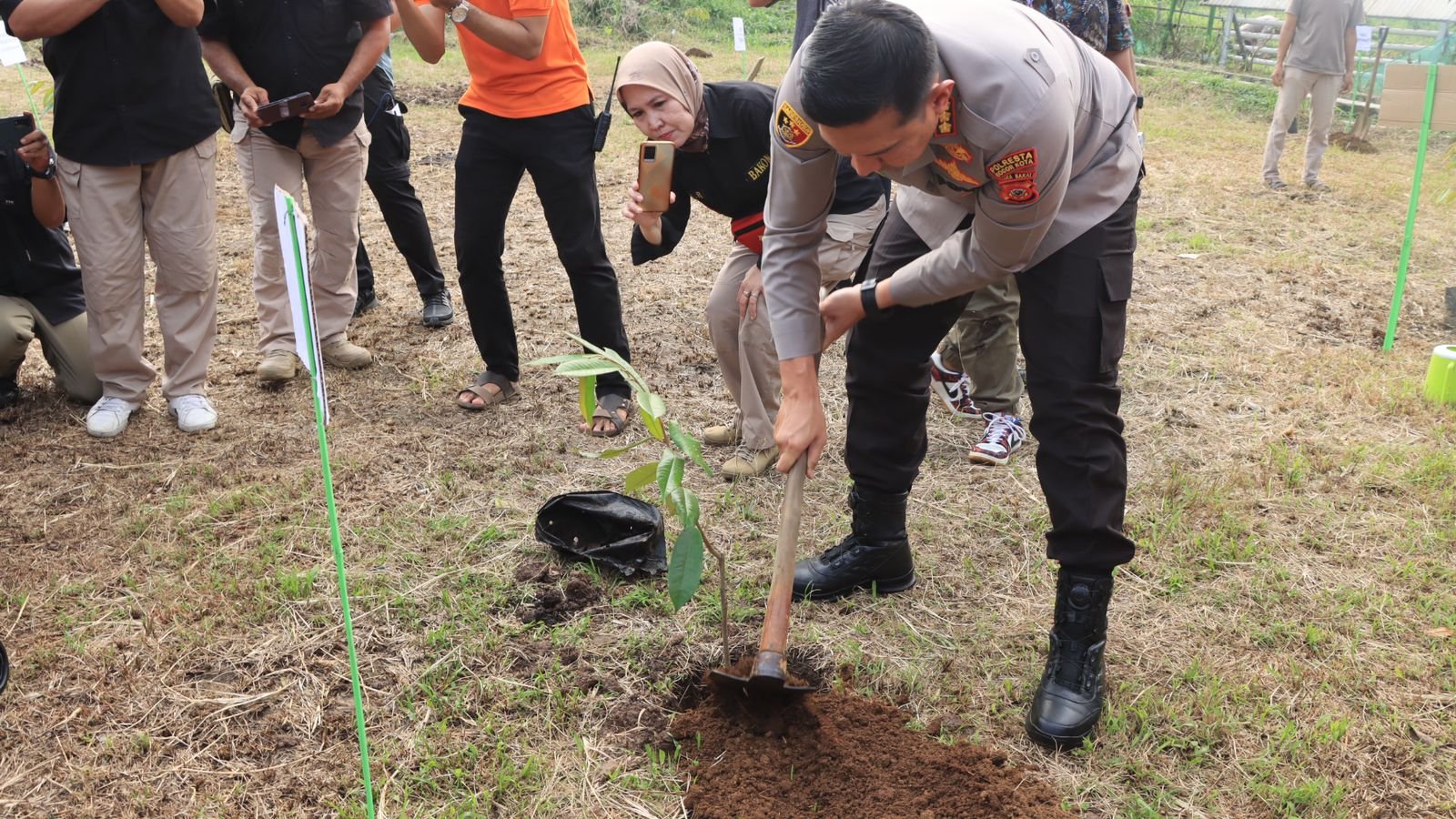 “Kegiatan ini merupakan bagian dari pemberdayaan daerah yang kurang produktif menjadi produktif dengan penanaman berbagai pohon yang berbuah seperti duren mangga jambu pete dan lain sebagainya sumbangan dari Kementerian Lingkungan Hidup sebanyak 300 pohon,” ujar Kombes Bismo.