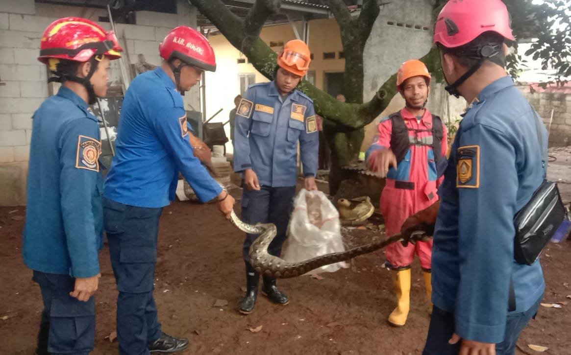 Dengan sejumlah alat seperti grapstik dan snake hook, anggota Damkar Kabupaten Bogor berhasil mengevakuasi ular yang ukurannya telah membesar.