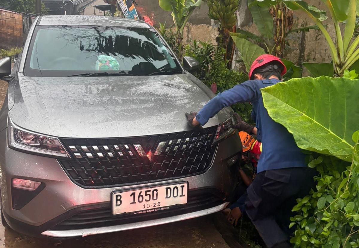 Bogor24Update – Petugas pemadam kebakaran (Damkar) Kabupaten Bogor melakukan evakuasi satu unit mobil Wuling Alvez yang terperosok ke saluran air di Jalan R. Aspia, Kelurahan Karadenan, Kecamatan Cibinong.