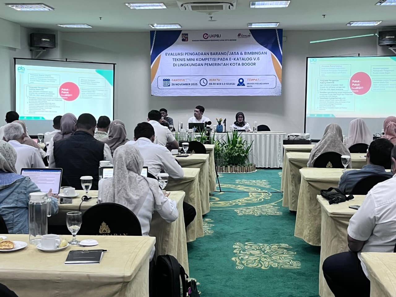 Bogor24Update – Bagian Pengadaan Barang dan Jasa (PBJ) menggelar evaluasi pengadaan barang jasa dan bimbingan teknis (Bimtek) terkait mini kompetisi pada E-Katalog V.6 pada lingkungan Pemerintah Kota (Pemkot) Bogor di Hotel Grande Pajajaran, Kelurahan Bantarjati Kecamatan Bogor Utara, Rabu, 26 November 2025.