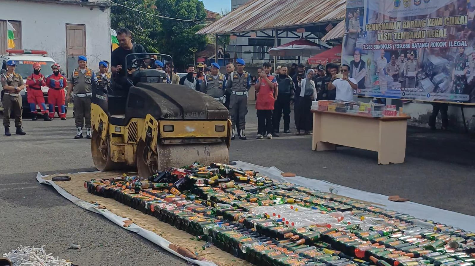 Barang bukti yang dimusnahkan terdiri dari 2.237 botol minuman beralkohol dengan total volume mencapai 1.521 liter, serta 7.938 bungkus atau 159.660 batang rokok ilegal noncukai.