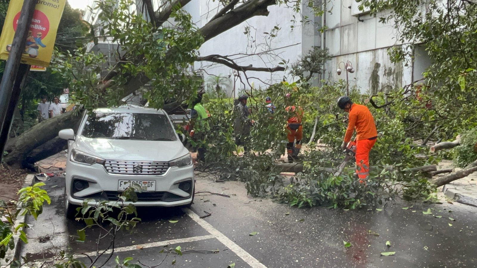 “Tadi habis hujan sekitar jam setengah empat. Itu tiba-tiba pohonnya ada bunyi berisik. Terus pas kita lihat, pohonnya sudah bersandar di mobil, sudah penyok,” kata Abdan (33), warga sekitar.