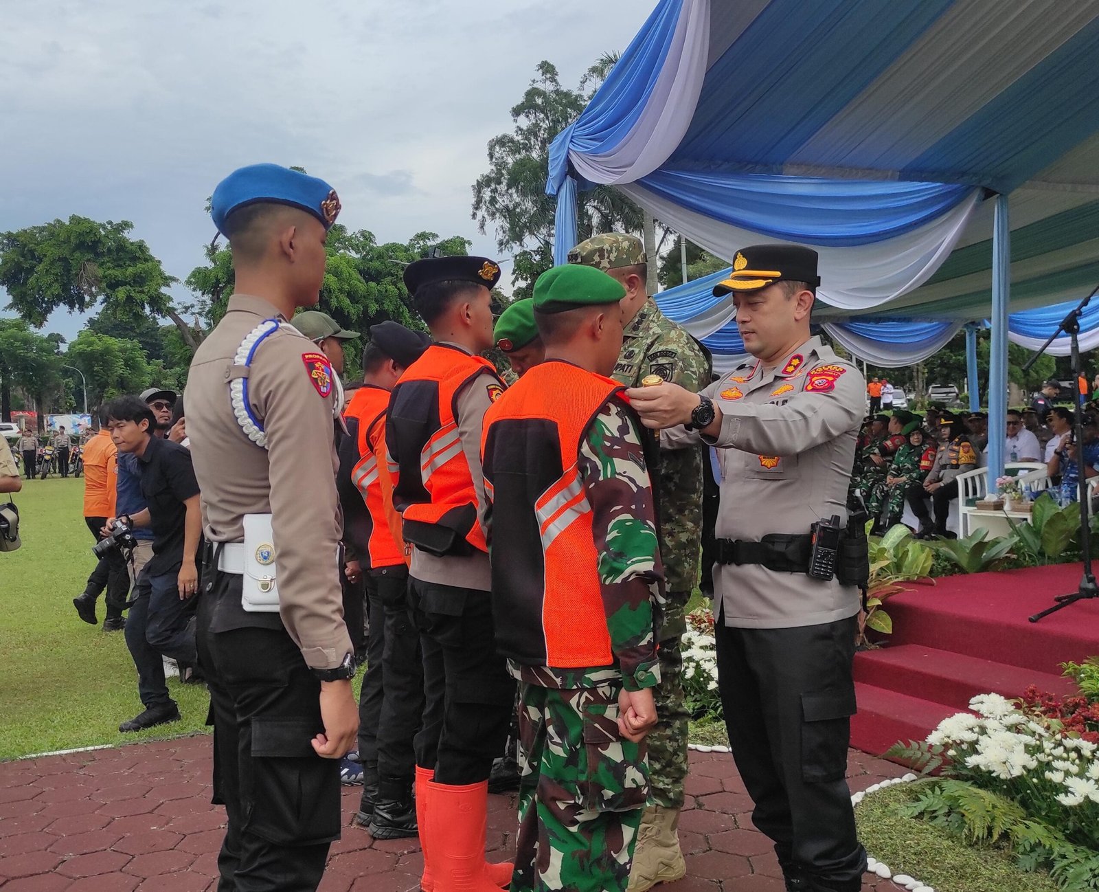 Kapolres Bogor, AKBP Wikha Ardilestanto memakaikan rompi kepada petugas tanggap bencana dalam apel gelar pasukan di Lapangan Tegar Beriman, Cibinong, Kabupaten Bogor (Anggi Juhairiah | Bogor24Update)