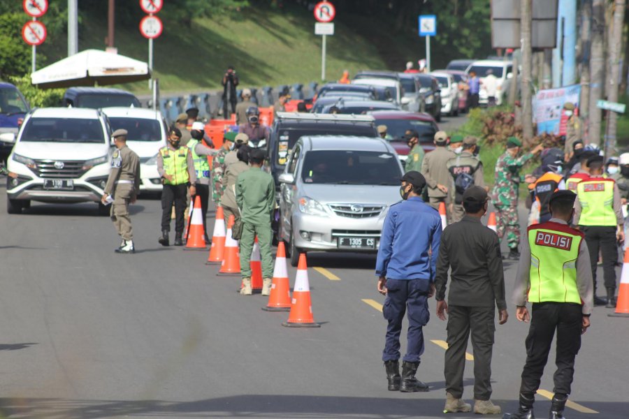 Petugas saat memberlakukan penerapan aturan buka tutup jalur Puncak Bogor hingga satu arah dan ganjil-genap. (Foto: Dok. Bogor24Update)