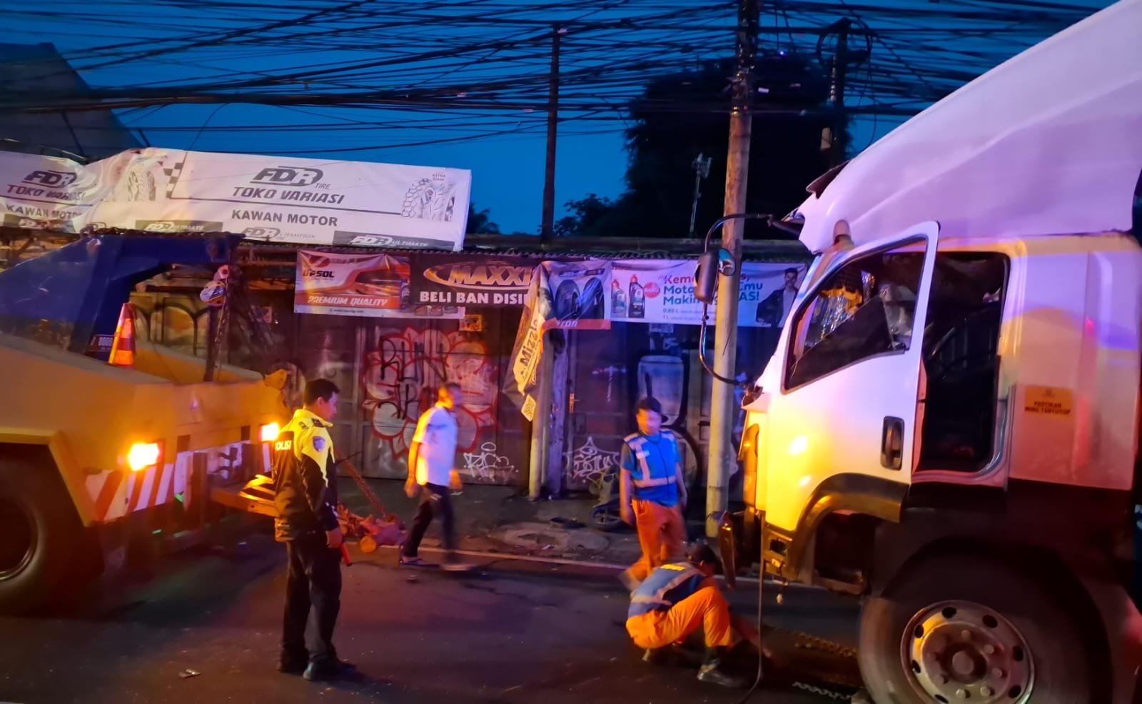 Bogor24Update – Kecelakaan lalu lintas tunggal yang mengakibatkan truk menabrak sebuah toko spare part motor terjadi di Jalan Raya Jakarta-Bogor, Kelurahan Cirimekar, Kecamatan Cibinong, Kabupaten Bogor, Kamis 5 Februari 2026.