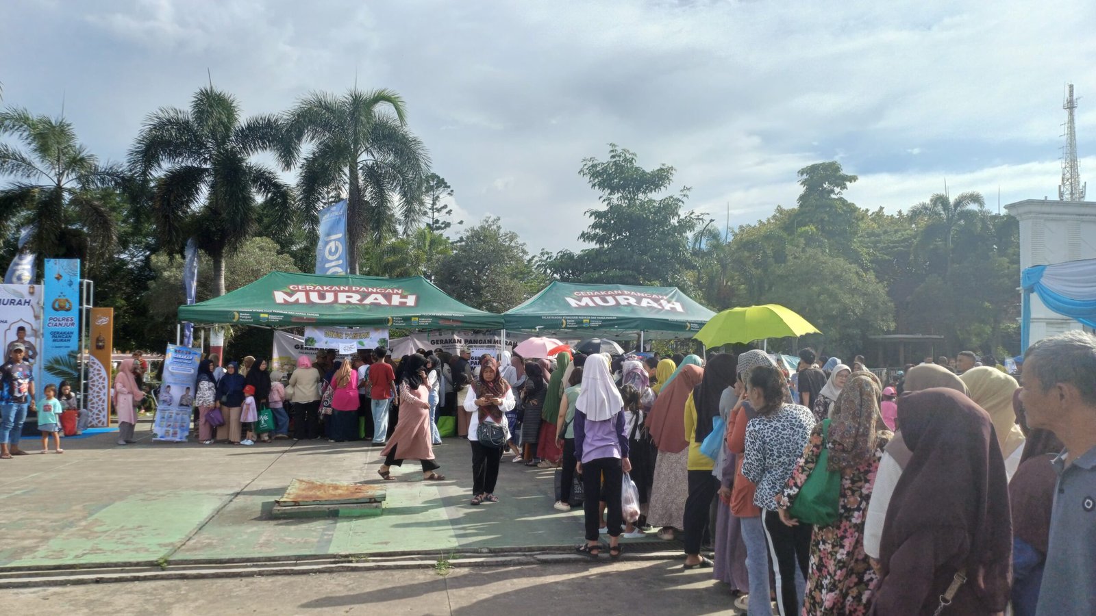 Cianjur24update – Ratusan warga yang didominasi kaum ibu memadati Alun-alun Cianjur untuk berburu bahan pangan murah dalam kegiatan Gerakan Pangan Murah yang digelar Polres Cianjur, Rabu 11 Maret 2026.